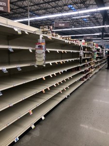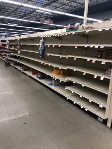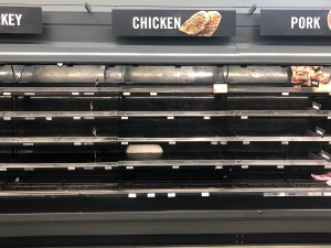 We have continued to buy groceries and eat fresh food as long as possible. I ventured out this morning to see if I could get some last minute items and assess the situation first hand. What I found was a supermarket without any meat, pasta, pasta sauce, and toilet paper.